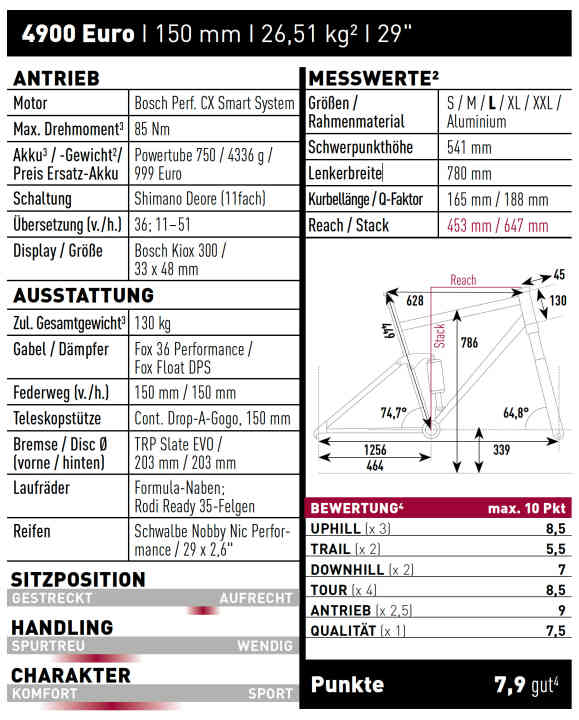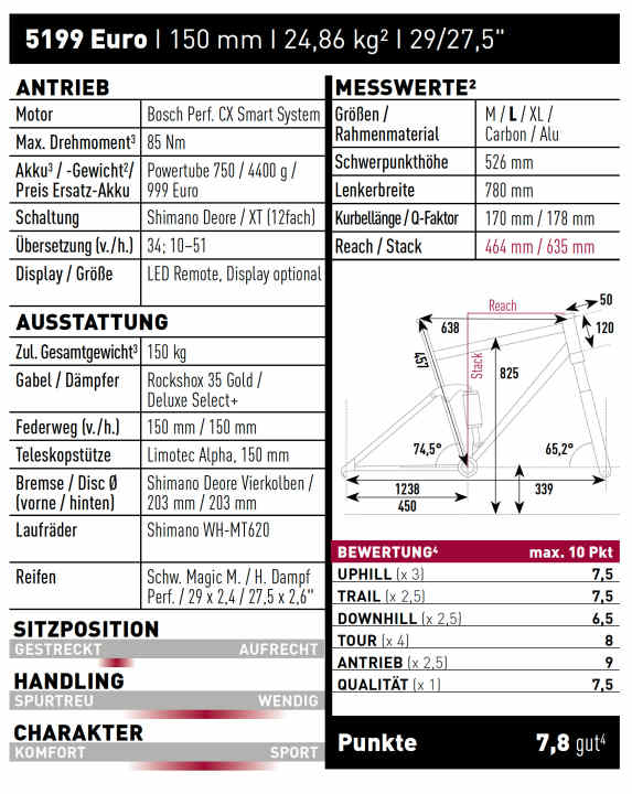 Komfortables Touren-Bike mit guter Ausstattung und stimmigem Fahrverhalten. Im Gelände fährt es sicher und neutral, doch wendiger Trail-Charakter fehlt. Leider sehr schwer.