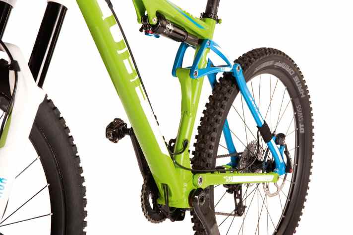 Wo hört All Mountain auf, wo fängt Enduro an? Beim neuen Cube AMS stellt man sich diese Frage, denn das neue Bike im 650B-Format ist tourentauglich und dennoch Endurogemäß abfahrtsorientiert. Der Blick auf den massiven Rahmen und die Ausstattung zeigt sofort, dass dieses Bike sein Leben nicht auf Forstwegen fristen möchte. Reverb-Stütze, Kettenspanner, Hans-Dampf-Schlappen und die mächtige Rock-Shox-Pike-Gabel wollen im adrenalingeschwängerten Umfeld ausgeritten werden, dort wo Federweg nur durch noch mehr Federweg ersetzt werden kann. Im Vergleich zum Vorgänger läuft das neue AMS mit flacherem Lenkwinkel, bewusst kurzen Kettenstreben und einer insgesamt moderneren, auf 650B angepassten Geometrie auf. Der 102 Nm/Grad steife Rahmen wiegt 3220 Gramm ohne Dämpfer – das weist den Weg.