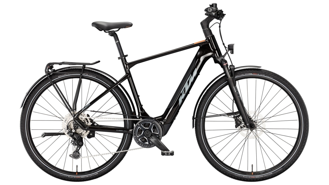 Der Sattel ist ein Selle Royal Explora Gel, montiert auf einer KTM Line Sattelstütze mit den Maßen 27.2/350 mm und einer KTM Line Sattelklemmung mit 31.8 mm Durchmesser. Schutzbleche vom Typ SKS EVO AL in Schwarz matt mit einer Breite von 55 mm sorgen für zusätzlichen Schutz vor Schmutz und Wasser. Ein Hebie 28" verstellbarer Ständer und ein KTM light Gepäckträger (snap-it 2.0) runden die Ausstattung ab.