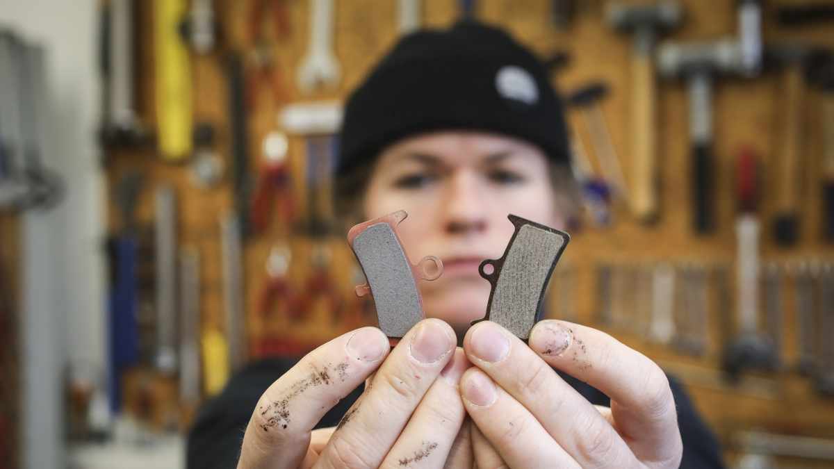 Felgenbremsbeläge sind wesentlich dicker und weicher als die von Scheibenbremsen. Ihr Austausch sollte spätestens dann erfolgen, wenn die Rillen zwischen den Blöcken weggebremst sind. Aus der Felge gerissene Alu-Partikel, die im Bremsbelag stecken, müssen mit Nadel oder Schraubendreher entfernt werden, sonst graben sie Riefen in die Felgenflanken.